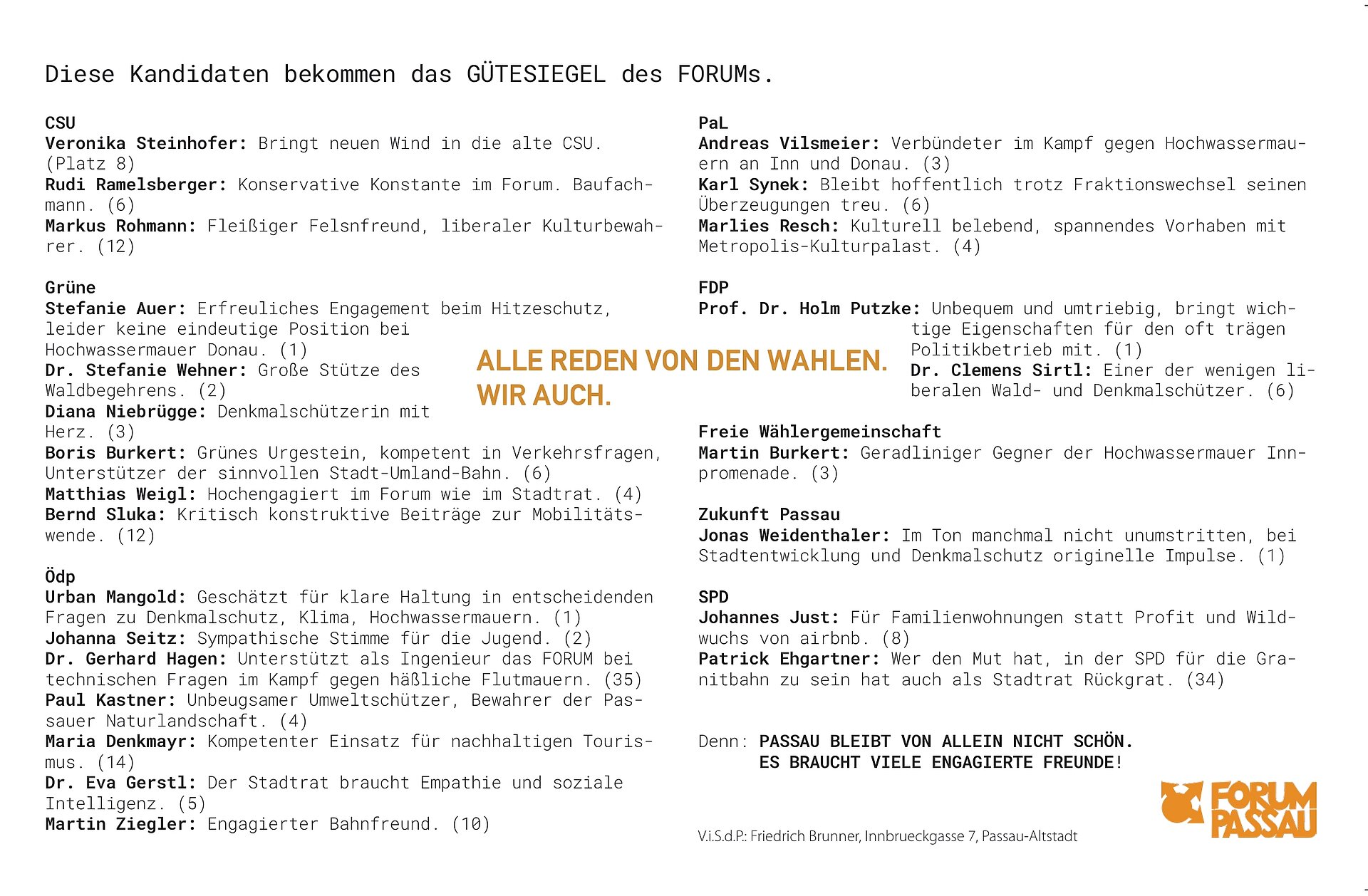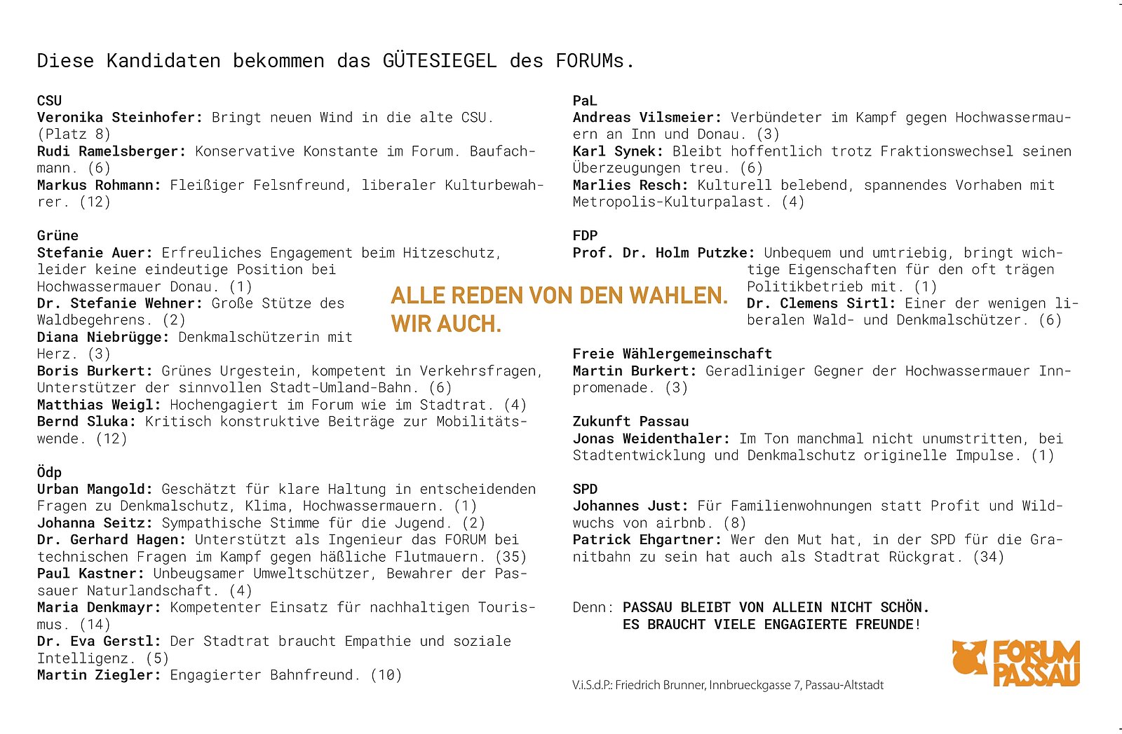 Wie bereits in Vergangenheit postioniert sich unser Verein im Vorfeld der Kommunalwahl. Unsere Empfehlungen zur Wahl 2020 finden Sie in unserem Zeitungsarchiv oder unter diesem Link: FORUM PASSAU 53